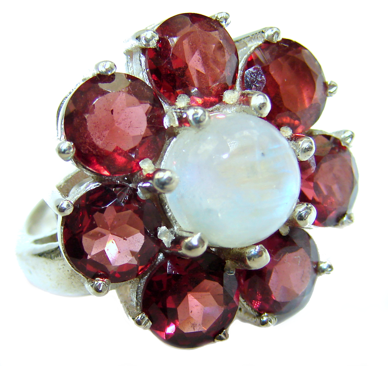 Fire Moonstone Garnet .925 Sterling Silver handcrafted Cocktail ring size 6