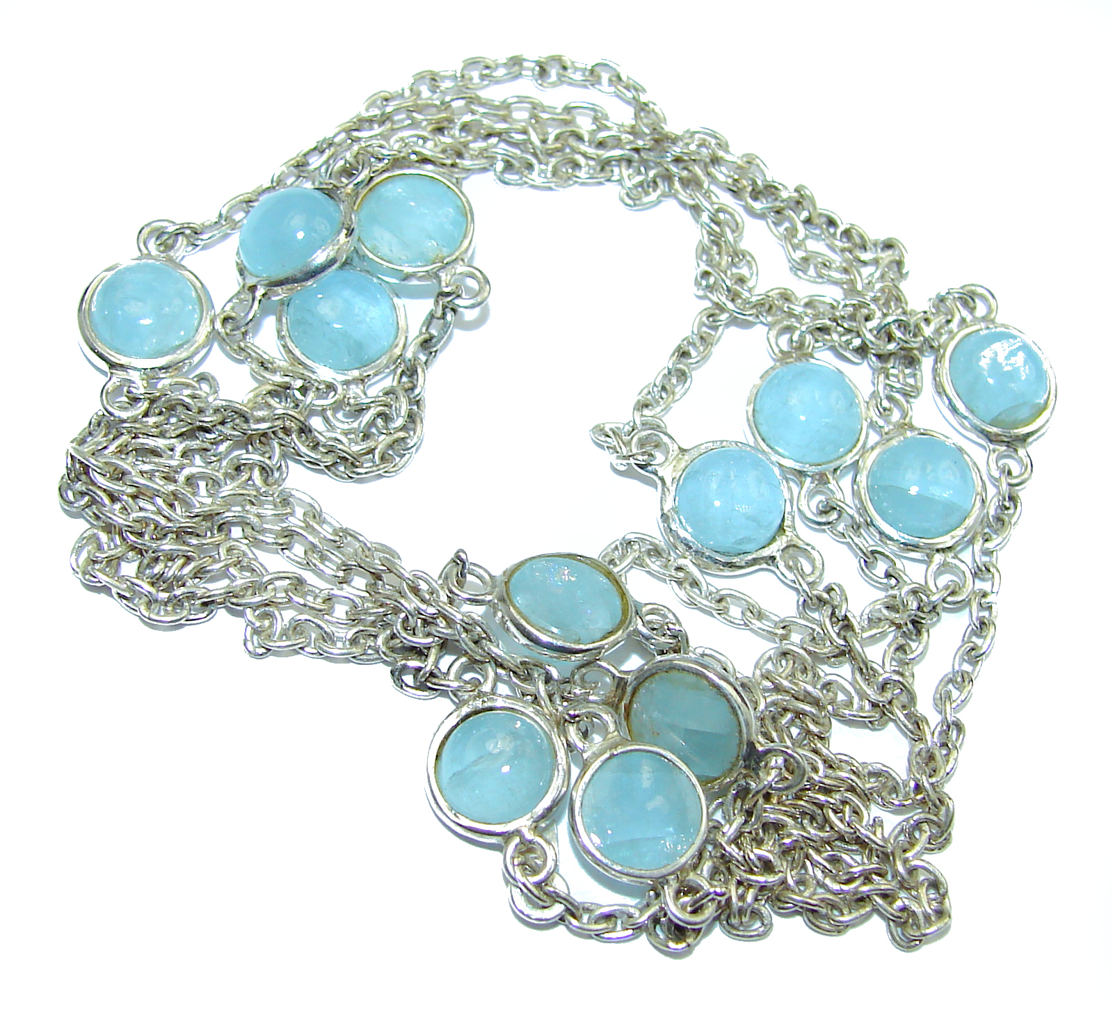 36 inches genuine Aquamarine .925 Sterling Silver handmade station Necklace