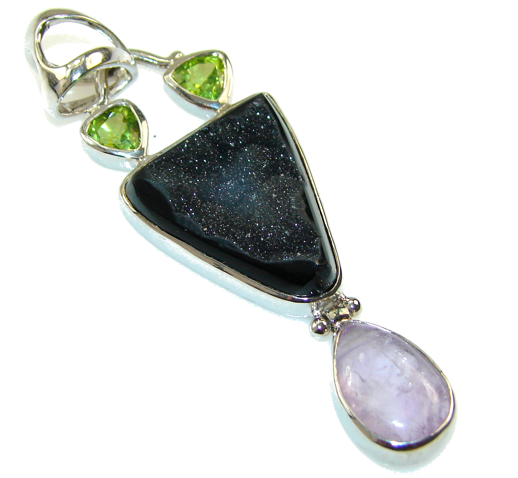 Spirit Of Peace!! Black Agate Druzy Sterling Silver Pendant