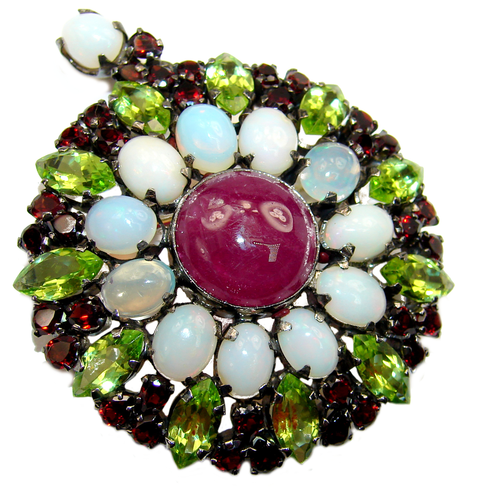 Precious Treasure Genuine Ruby Opal Sapphire .925 Sterling Silver handmade Pendant - Brooch
