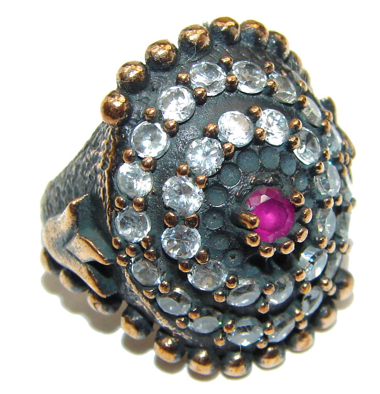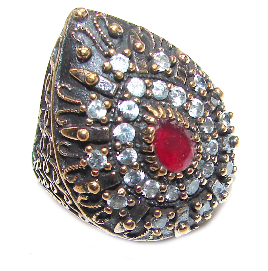 Victorian Style created Ruby & White Topaz Copper over Sterling Silver ring; s. 7
