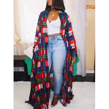 Lovely Casual Turndown Collar Grid Print Red Long Plus Size Coat