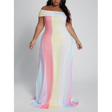 Lovely Stylish Dew Shoulder Rainbow Striped Yellow Maxi Plus Size Dress