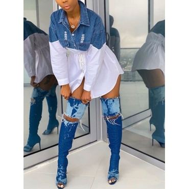 Lovely Trendy Turndown Collar Patchwork White Mini Denim Dress