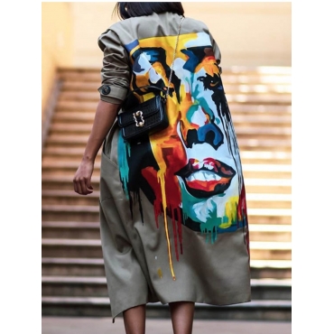 Lovely Street Turndown Collar Print Khaki Long Trench Coat