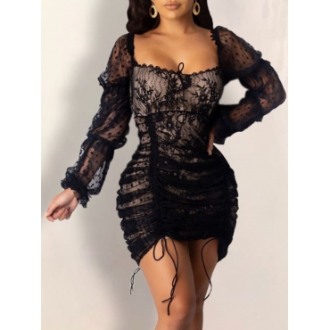 Lovely Trendy Square Collar See-through Drawstring Black Mini Dress