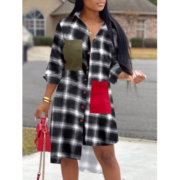 Lovely Trendy Turndown Collar Grid Print Asymmetrical White Knee Length Shirt Dress
