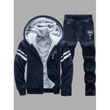 Lovely Casual Hooded Collar Print Zipper Design Deep Blue Men Two-piece Pants Set