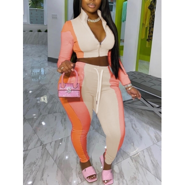 Lovely Sportswear Patchwork Zipper Design Apricot Plus Size Two-piece Pants Set