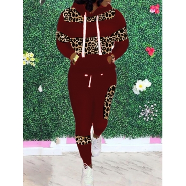 Lovely Casual Hooded Collar Leopard Print Patchwork Red Two Piece Pants Set