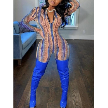 Lovely Trendy Print Zipper Design Skinny Blue One-piece Jumpsuit