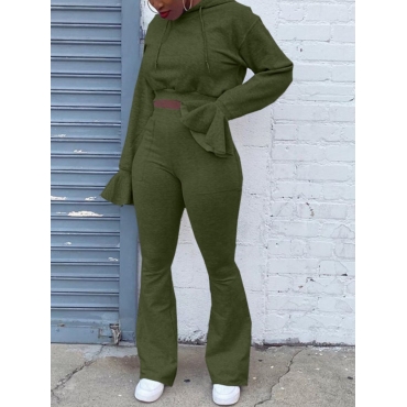 Lovely Sweet Hooded Collar Horn Sleeves Army Green Two Piece Pants Set