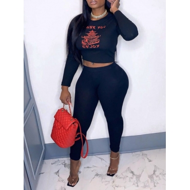 Lovely Casual O Neck Print Skinny Black Two Piece Pants Set