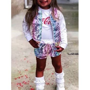 Lovely Stylish O Neck Patchwork Sequined White Girl Two-piece Shorts Set