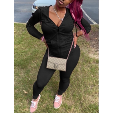 Lovely Casual Folds Kangaroo Pocket Black Plus Size Two-piece Pants Set