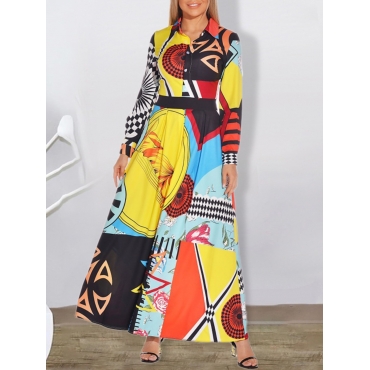 Lovely Trendy Shirt Collar Print Yellow Ankle Length Dress