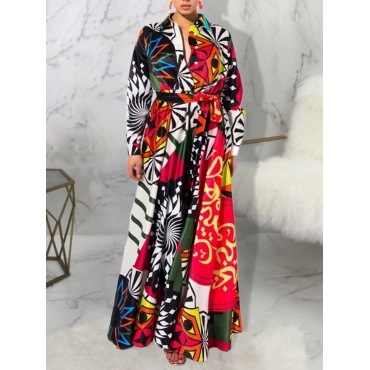 Lovely Trendy Turndown Collar Print Red Maxi Dress