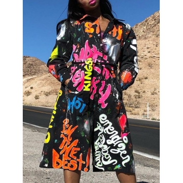 Lovely Street Turndown Collar Letter Print Black Trench Coat