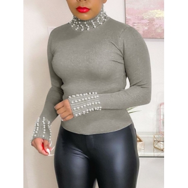 Lovely Street Turtleneck Pearl Decorative Grey Tshirt
