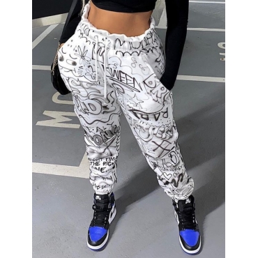 Lovely Street Letter Print Drawstring White Pants