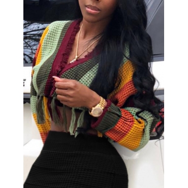 Lovely Street V Neck Rainbow Striped Tassel Design Multicolor Sweater