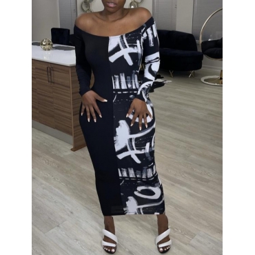Lovely Trendy Dew Shoulder Print Skinny Black Mid Calf Dress