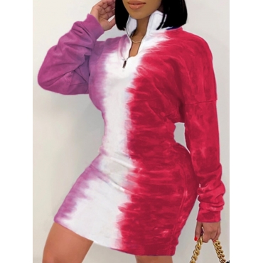 Lovely Stylish Turndown Collar Tie-dye Zipper Design Rose Red Knee Length Dress
