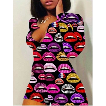 Lovely Casual Lip Print Skinny Black One-piece Romper