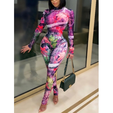 Lovely Casual O Neck Print Skinny Rose Red One-piece Jumpsuit