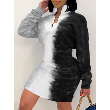 Lovely Stylish Turndown Collar Tie-dye Zipper Design Black Knee Length Dress