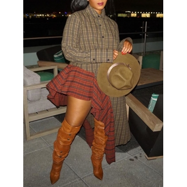 Lovely Stylish Turndown Collar Patchwork Asymmetrical Brown Ankle Length Plus Size Dress