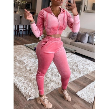 Lovely Sportswear Hooded Collar Zipper Design Pink Two Piece Pants Set