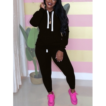 Lovely Casual Hooded Collar Kangaroo Pocket Black Two Piece Pants Set