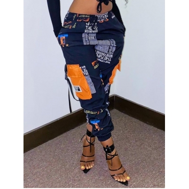Lovely Street Pocket Patched Letter Print Black Pants