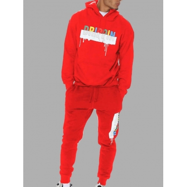 Lovely Casual Hooded Collar Letter Print Red Men Two-piece Pants Set