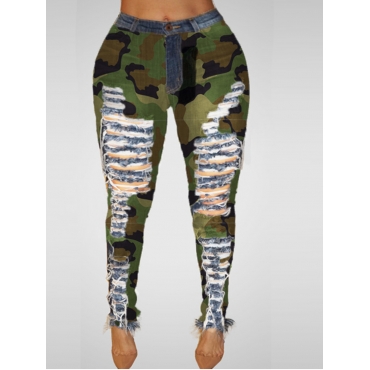 Lovely Casual Broken Holes Camo Print Jeans