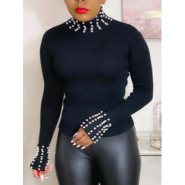 Lovely Street Half A Turtleneck Pearl Embellished Black T-shirt