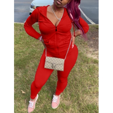 Lovely Casual Hooded Collar Kangaroo Pocket Red Two Piece Pants Set