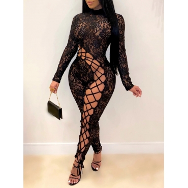 Lovely Sexy Turtleneck Lace Patchwork Hollow-out Black Plus Size One-piece Jumpsuit