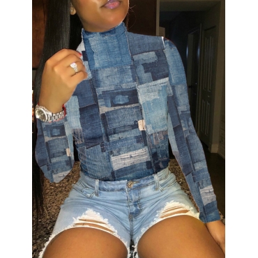 Lovely Street Turtleneck Print Patchwork Blue T-shirt