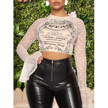 Lovely Street Letter Print See-through Flare Sleeve Apricot T-shirt