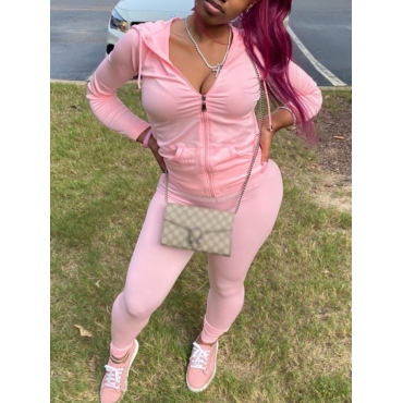 Lovely Casual Hooded Collar Kangaroo Pocket Pink Two Piece Pants Set