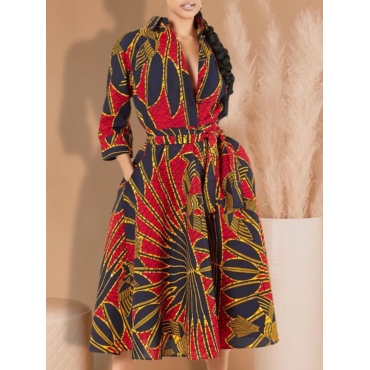 Lovely Stylish Turndown Collar Print Red Mid Calf Dress