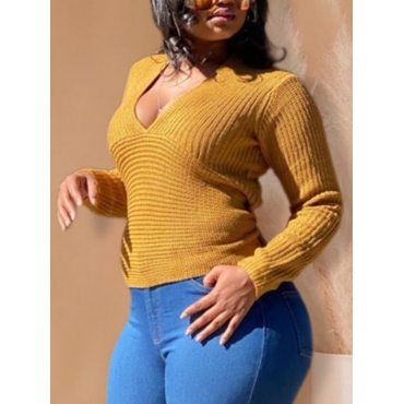 Lovely Casaul V Neck Long Sleeve Yellow Sweater