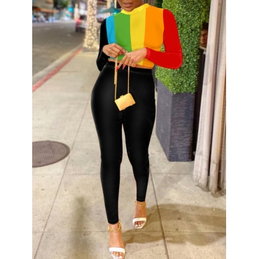 Lovely Casual Mandarin Collar Rainbow Striped Patchwork Multicolor Two Piece Pants Set