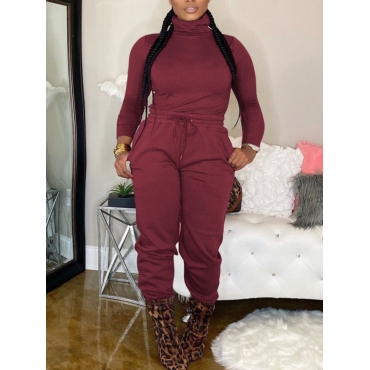 Lovely Casual Turtleneck Drawstring Wine Red Two Piece Pants Set