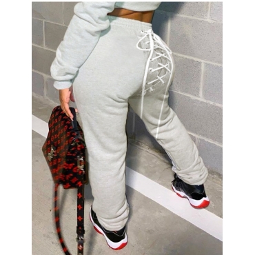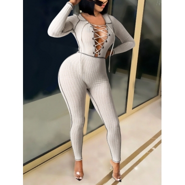 Lovely Daily Cross Strap Long Sleeve Skinny Grey One-piece Jumpsuit