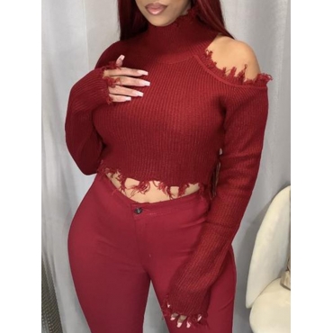 Lovely Stylish Turtleneck Hollow-out Wine Red Sweater