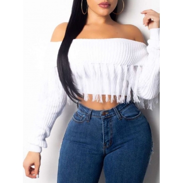 Lovely Stylish Dew Shoulder Tassel Design White Sweater