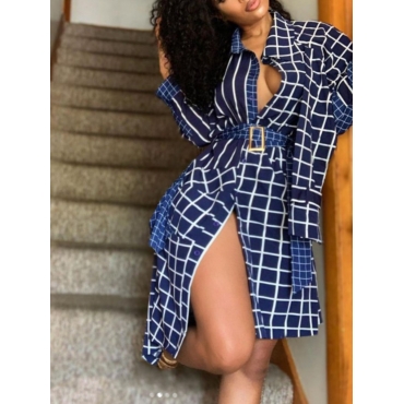 Lovely Casual Turndown Collar Grid Print Blue Knee Length Plus Size Dress